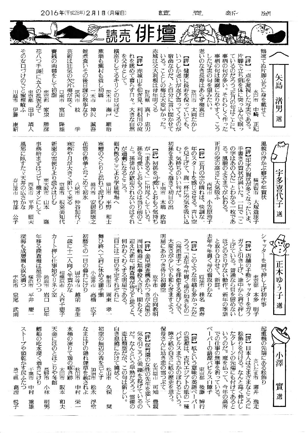 大塚進氏(学化38卒)が2016.2.1読売俳壇全国版で入賞:投稿(白石道彦:学化38卒)